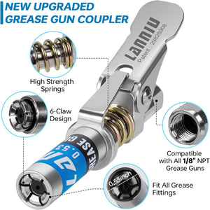 - Upgraded, Durable and Stable - LANNIU grease gun coupler come with the exclusive patent in United States, reinforced with 6 claws and sealing gasket, to ensure long-lasting and stable performance, even at high pressure of 12000PSI. leak-proof guaranteed with durable carbon steel construction