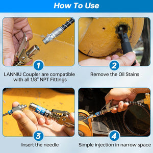 - Compatible with All 1/8” NPT Fittings - this portable grease gun coupler is fit for all 1/8" NPT standard grease guns, pneumatic grease guns, manual grease guns, electric grease guns, compatible with all DIN and SAE grease nipples, all SAE and Metric fittings