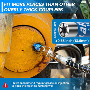 - Ultra Compact Design - Our grease gun coupler diameter is 0.53”, smaller than others in the market, easily grease hard to reach fittings in machinery, automotive chassis, or cramped equipment in tight spaces, with the reinforced 6 jaw design, the coupler is easier to close and buckle the grease nozzle, tighter, no oil leakage
